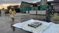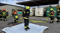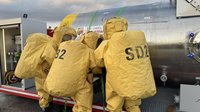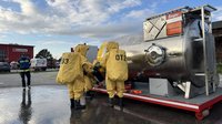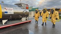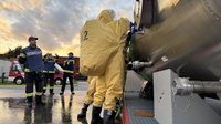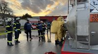 Übungsannahme war der Austritt einer unbekannten Flüssigkeit aus einem Tankauflieger. Nach der Lageerkundung stellte der Einsatzleiter fest, dass es sich um flüssiges Ammoniak handelte. Da diese Substanz stark gesundheitsschädlich ist, mussten Atemschutzträger in Schutzanzügen der Stufe 3 das Leck am unteren Rand des Tankwagens abdichten. Parallel dazu wurde ein Not-Dekontaminationsplatz eingerichtet, um die eingesetzten Kräfte nach ihrem Einsatz fachgerecht zu dekontaminieren.
